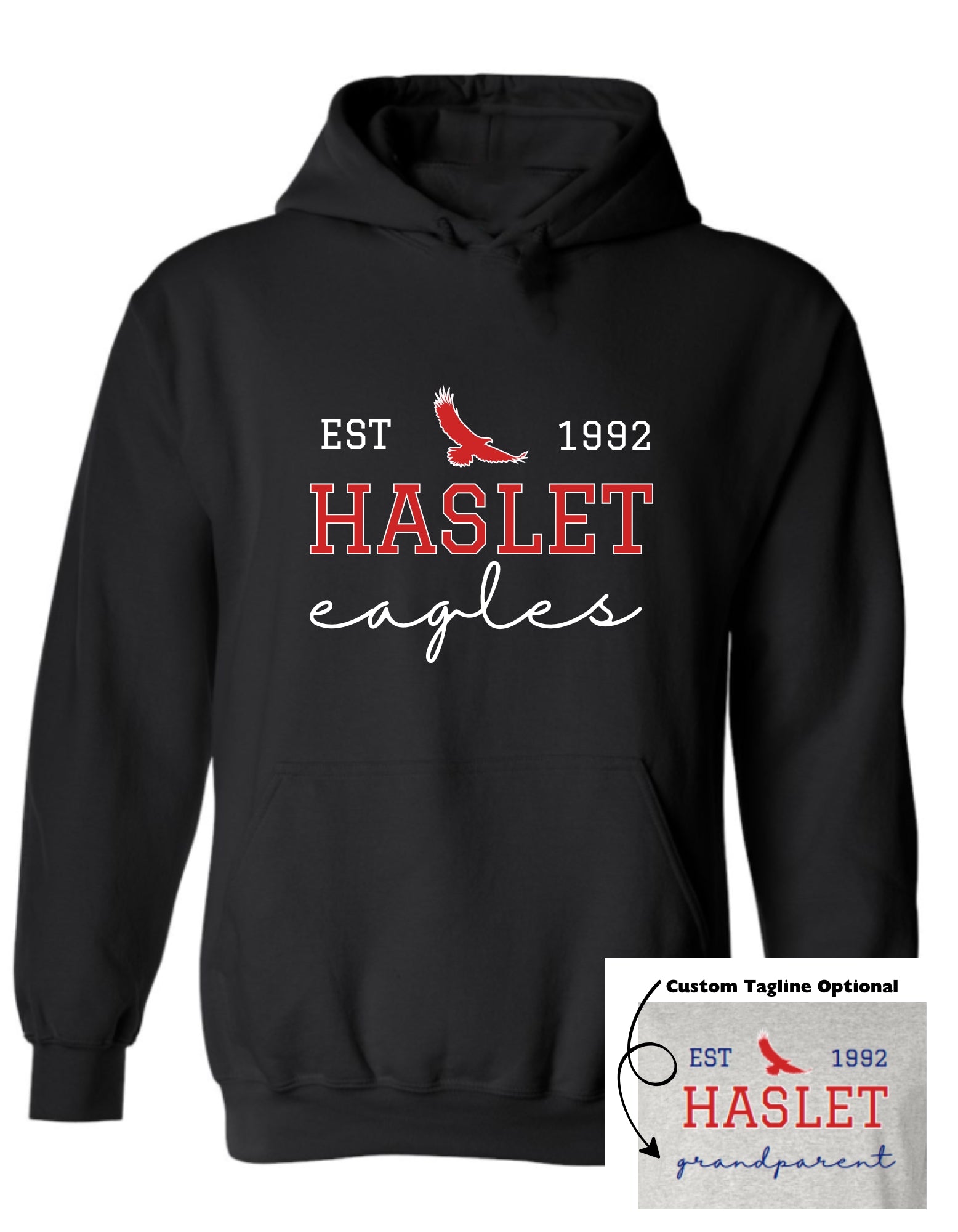 Show your eagle pride with this customizable Haslet 24-25 Spirit Hoodie! Perfect for students and parents/grandparents alike, this classic shirt displays the Eagles EST 1992 tagline. Let everyone know you're part of the eagle family with this spirited shirt. Go eagles!